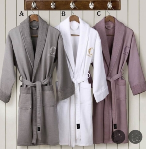 طراحی ساده با کمربند پهن و دو جیب جانبی، مناسب برای استفاده روزمره در خانه یا هتل.